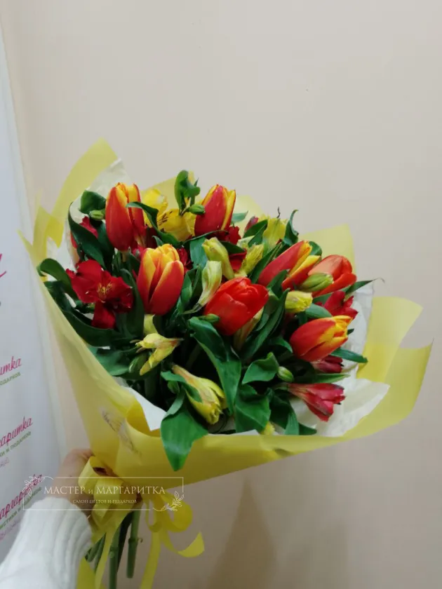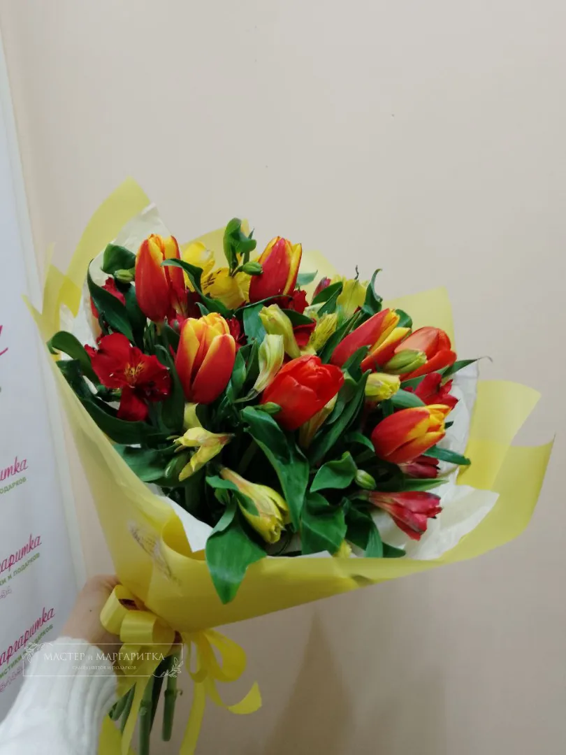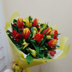 Жизнерадостный букет из свежих тюльпанов для любимых и дорогих людей! Каждый букет уникален, поэтому возможно отличие по наполнению, цветовой гамме и упаковке от представленного на фото.