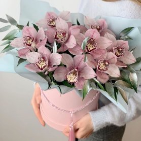 Очаровательная композиция из стойкой орхидеи. Цветовую гамму цветка можно согласовать с флористом при подтверждении заказа.