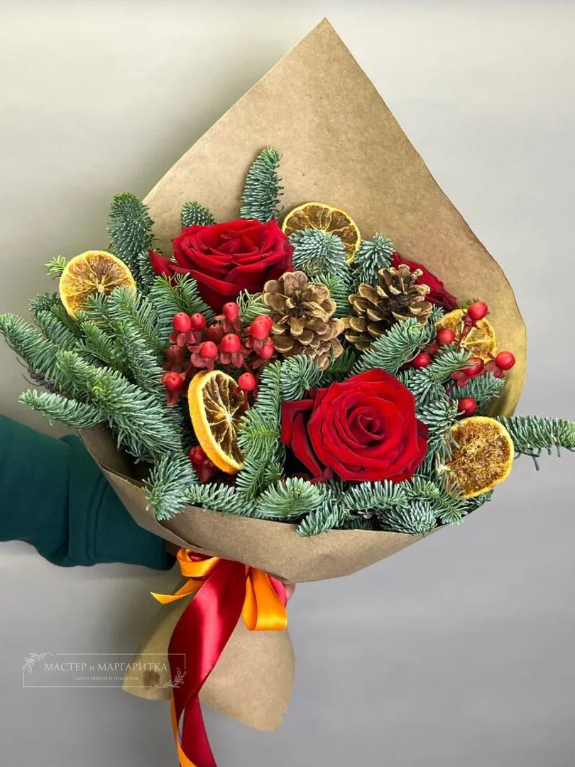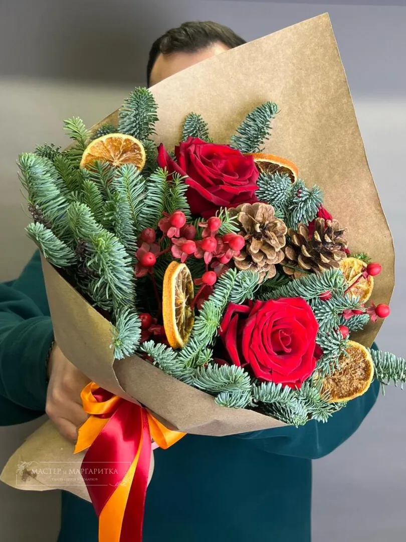 Новогодний букет из ароматной ветви ели нобилиса и прекрасных красных роз! Такой букет передаст атмосферу праздника и запомнится получателю, став прекрасным подарком на новогодние и рождественские праздники!