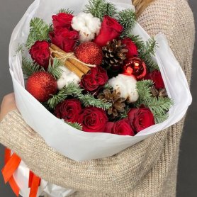 Букет с еловыми ветками и шишками, с хлопком и палочкой корицы для аромата в сочетании с классическими красными розами обязательно подарит новогоднее настроение